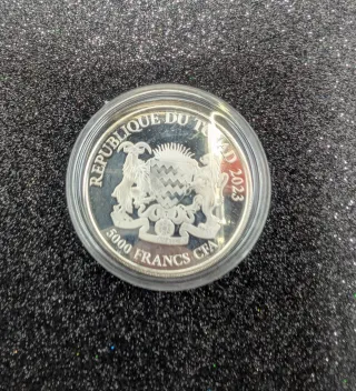 Moneda de plata de 1 onza con pureza de 999.9. Presenta un diseño de la Diosa Europa montada sobre un toro, con un sol naciente al fondo. - Material: Plata fina. - Peso: 1 onza. - Pureza: 99.9%. - Chad 2023