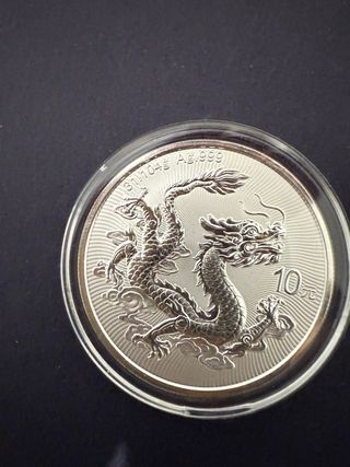 Moneda de plata conmemorativa del Dragón Chino. - Peso: 31.104g - Pureza: Ag.999 - Diseño detallado de dragón con nubes. - Valor nominal de 10 Yuanes.