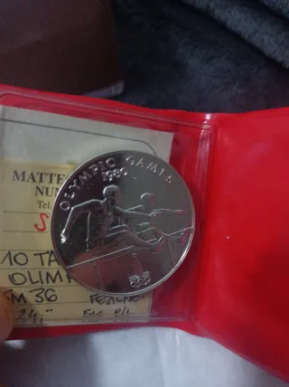 Moneda de plata conmemorativa de los XXV Juegos Olímpicos de Verano. - Diseño con figura atlética y llama olímpica. - Año: 1992. - Inscripción: XXV OLIMPIADI JATEKOK BARCELONA 1992. 28 gramos de PLATA de 0,925
