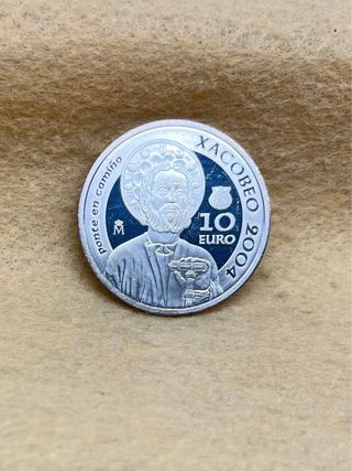 Moneda conmemorativa de plata del Xacobeo 2004. - Valor facial de 10 euros. - Diseño con figura de peregrino y concha. - Año de emisión: 2004.