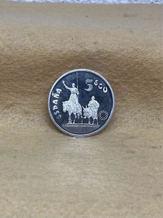 Moneda conmemorativa de plata de 5 ECU de 1994, con la efigie de Miguel de Cervantes. 33,6 plata 925mm - Material: Plata. - Año: 1994. - Denominación: 5 ECU.