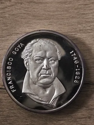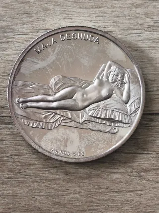 Moneda conmemorativa de Francisco de Goya. Muestra "La maja desnuda" Acabado proof Tiene algo de pátina - Peso: 5 onzas. - Material: Plata pura 999 - Grabado: Francisco de Goya. - Fechas: 1746-1828.