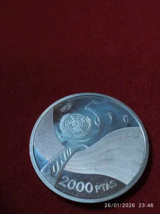 Moneda conmemorativa de plata de 2000 pesetas de la ONU, año 1995. - Diseño con el emblema de la ONU. - Grabado ONU y 2000 PTAS. - Acabado en plata.