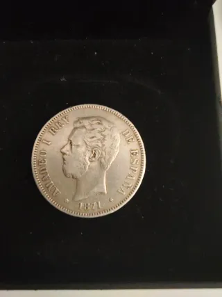 Moneda de plata conmemorativa del Rey Amadeo I de España, acuñada en el año 1871. Estrella 71 - Diseño detallado del perfil del rey. - Inscripción AMADEO I REY DE ESPAÑA. - Año de acuñación: 1871.