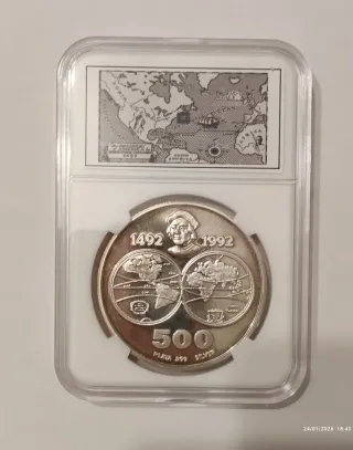 Conjunto de medallones de plata conmemorativos del Quinto Centenario. - 5 unidades (168g/ud) - Diseño detallado con escudos y retratos. - Valor nominal de 10.000 pesetas. - Presentados en cápsulas protectoras individuales. - Plata 0.925 - Se vende al peso de plata fina según su cotización en cada momento.