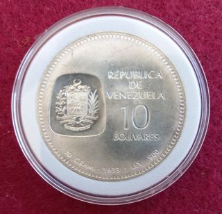 Moneda Conmemorativa 10 Bolívares 1973 - Centenario de la efigie de Simón Bolívar. Acuñada por el Banco Central de Venezuela en plata 0.900, con un peso de 30 g y 39 mm de diámetro. Emisión especial de solo 2 millones de ejemplares, conocida como el “Doblón de Plata”. Pieza con gran valor histórico y muy buscada por coleccionistas. Se encuentra en buen estado de conservación. Se puede realizar entrega en mano en las provincias de Tarragona, Castellón y Valencia o envío por mensajería a cuenta del comprador. Mira mis otros artículos. Pregunta disponibilidad y cualquier duda sin compromiso. Intentaré responder lo antes posible.