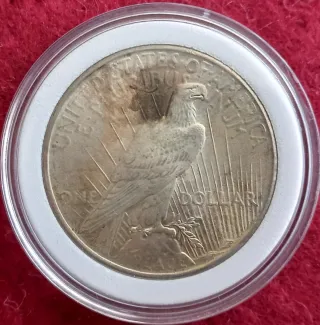 Moneda de plata Peace Dollar 1924, una pieza histórica de la Casa de la Moneda de EE. UU. Precio spot del momento. Acuñada en plata 0.900, muestra en el anverso el elegante diseño de la Libertad y la inscripción "In God We Trust", mientras que el reverso presenta al águila posada sobre una roca con la palabra Peace. Año de acuñación: 1924. Una moneda con gran valor numismático y muy buscada por coleccionistas. Se encuentra en buen estado, aunque con manchas como se puede ver en las fotografias.