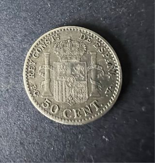 Moneda de plata de 50 Cents de España, acuñada en el año 1880. - Anverso: Retrato de Alfonso XII. - Reverso: Escudo de España. - Canto: Estriado. - Composición: Plata 0.835.