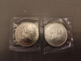 Se venden al precio que esté la Plata en el momento de la transcion + 2% Lote completo: 3 monedas de 2000 pesetas - 49,95g de plata pura 3 monedas de 100 pesetas de 1966 - 45,06g de plata pura 7 monedas de 2 pesetas - 58,45g de plata pura 3 monedas de 1 peseta - 12,52g de plata pura Se venden al precio que esté la Plata en el momento de la transacción + 2%