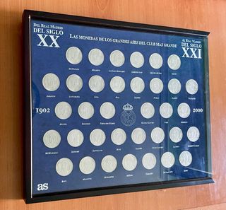 Colección de monedas conmemorativas del centenario del Real Madrid bañadas en plata Presentadas en un marco de madera con fondo azul. Están en perfecto estado lo único el marco la marca que tiene en la última foto - Incluye 12 monedas. - Marco de madera con cristal. - Diseño conmemorativo del club.
