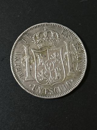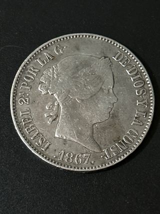 Moneda de plata de Isabel II acuñada en el año 1867. - Canto con inscripción. - Diseño detallado de la reina. - Inscripción ISABEL 2ª POR LA G. DE DIOS Y LA CONST.