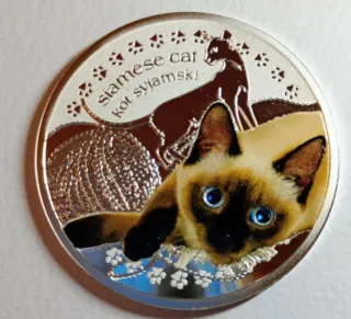 Certificado de autenticidad para la moneda Gato Siamés de la serie Amigos del Hombre - Gatos. - Moneda de curso legal de Nueva Zelanda. - Emitida por Mennica Polska. - Peso: 17.50 g. - Material: Ag 999. - Acabado: Proof. - Decoración: Cristales Swarovski. La moneda de la imagen es una moneda de prueba de plata de un dólar de Niue de 2014, parte de la serie "Los mejores amigos del hombre: Gatos", dedicada al gato siamés. Detalles de la moneda Emisor y Año: Emitida por la Isla de Niue en 2014. Material y Peso: Contiene 17,5 gramos (0,5627 onzas) de plata fina .999. Diseño del reverso: Muestra una imagen a color de un gato siamés, cuy