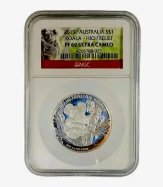 Moneda de plata de Australia del año 2013 con diseño de koala. Certificada por NGC. - Denominación: S$1 - Acuñación: High Relief - Grado: PF 69 Ultra Cameo - Metal: 999 Plata - Número de serie: 4265788-025