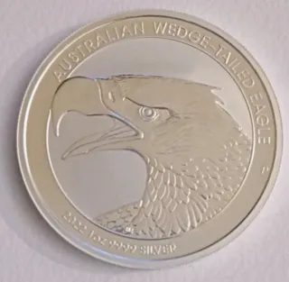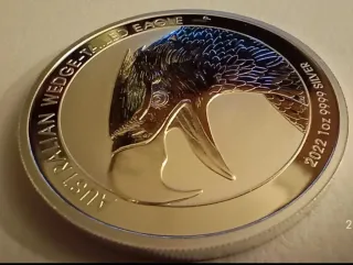 Moneda de Plata Australian Wedge-tailed Eagle de 1 onza del año 2022. Esta moneda es conocida por su pureza de 99.99% de plata fina.Detalles de la Moneda: Característica Detalle Metal Plata Pureza 99.99% pura Peso 1 onza troy (31.107 g) Año 2022 Valor facial 1 Dólar Australiano (AUD) Ceca The Perth Mint, Australia Diseñador John M. Mercanti Tirada máxima 50,000 unidades El reverso de la moneda, visible en la imagen, muestra un primer plano dramático de la cabeza del águila audaz (wedge-tailed eagle), destacando su ojo penetrante y su pico enganchado. El diseño es obra del reconocido escultor y grabador estadounidense John M. Merca