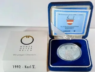 Preciosa moneda de Austria de 100 chelines, conmemorativa de Carlos V, acuñada en 1996. Se presenta en estuche original con certificado de autenticidad. - Edición limitada de 75.000 unidades. - Plata de 900/1000. - 18g de peso. - 34mm de diámetro. Características físicas Grosor: 2,6 mm Borde: Estriado Diámetro: 34,0 mm Peso: 20,0 g País: Austria Acuñación: 75.000 Composición: Plata 0.900 Diseñador: Herbert Wähner Número de Krause: 3007