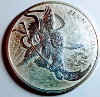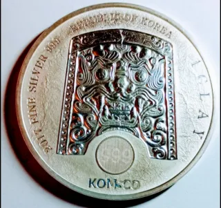 La moneda es la "ZI:SIN Gallus" de 1 onza de plata de 2017, la primera emisión de la serie ZI:SIN de la casa de la moneda oficial de Corea del Sur, KOMSCO. Detalles de la Moneda Emisor: República de Corea (KOMSCO). Año: 2017. Metal: Plata pura .999. Peso: 1 onza troy (31,1 g). Denominación: 1 Clay. Tirada limitada: Solo se acuñaron 33.300 unidades. Diseño e Historia Mito: Los ZI:SIN (Doce Guardianes) son figuras de la mitología coreana, los comandantes del ejército de Dios que protegen al mundo contra las fuerzas del mal. Reverso (imagen mostrada): Representa a Gallus, el guardián mensajero de la luz, vestido con indumentaria mili
