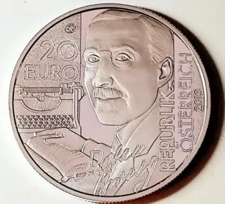 Austria 20€, Stefan Zweig 2013 Proof. Estado FDC Grosor 2,5 mm Borde Estriado Diámetro 34,0 mm Peso 20,0 gramos Plata 900 Tirada 50.000 piezas
