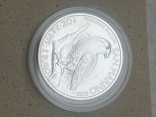 Moneda de plata pura de San Marino del año 2025. - Peso: 1 oz - Pureza: .999 plata - Valor nominal: 5 Euro - Diseño: Halcón Peregrino