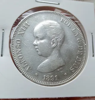 Antigua moneda de plata española perteneciente al monarca Alfonso XIII de Borbón. Denominación: 5 pesetas, duro de plata. - Peso 25 gramos - Ley: 900 milésimas. - Año 1891. Estrellas 18 - 91. ( Numismática Inversion Monedas Plata Silver Coín Argento Argent Centenario). NO BAJO PRECIO.