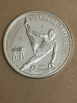 Moneda conmemorativa de Samoa de Plata (31,60 g .925) de las Olimpiadas en calidad Proof. Presenta algunas leves señales de inicio de pátina, casi inapreciable. - Diseño de gimnasia artística. - Año: 1993. - Denominación: 10 Tala. - País: Samoa.