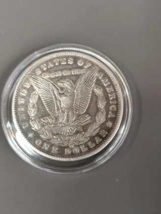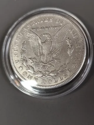 Moneda de un dólar Morgan de plata 26,7g-38,1mm-2,9mm - Diseño del águila. - Inscripción In God We Trust.