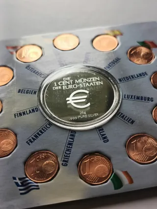 Este set incluye una moneda de de 26 gramos de plata pura 999 y 12 monedas de 1 cent sin circular, presentadas en estuche con certificado - Monedas de 1 céntimo de euro. - Presentación en estuche conmemorativo. - Incluye moneda de plata de 26g .999 Pure Silver.