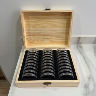 Caja de madera con capacidad para guardar onzas de plata y oro. Ideal para coleccionistas. - Material: Madera. - Color: Natural. - Interior forrado - Capacidad para 30 onzas. - Tamaños de onzas 46mm, 37mm, 32mm, 27mm, 22mm, 17mm - Incluye 30 cápsulas con sus respectivas almohadillas regulables en tamaño. válido para Onzas De Plata, y 1/10 de oro con varias variantes de tamaño.