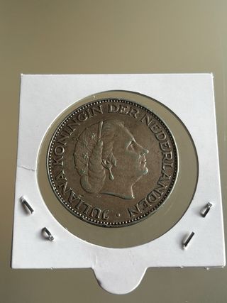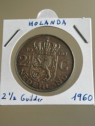 Moneda de 2 1/2 Gulden de plata de 1960 de la Reina Julians, acuñación de 15 gramos con pureza 0,720. En excelente conservación como se muestra en las fotografias, se envía encartonada y protegida.