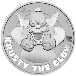 Onza de plata con la imagen de Krusty el Payaso. - Diseño detallado de Krusty el Payaso. - Inscripción KRUSTY THE CLOWN. - Firma MATT GROENING y ©20CF P visibles.