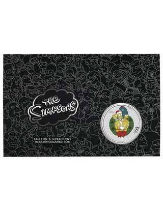 Onza de plata de 1 onza conmemorativa de The Simpsons y temática navideña coloreada - Diseño Season's Greetings. - Se entrega en blíster original - Ilustración de la familia Simpson con gorros de Papá Noel. - Tirada limitada 2500 Uds