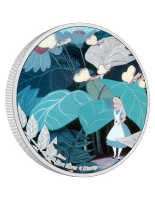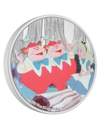 Cuarta, y última edición de la serie, conmemorativa de Alicia en el país de las maravillas - Diseño de Alicia y los gemelos Tweedledee y Tweedledum. - 1 oz de Plata Fina 999. - Licencia oficial de Disney.