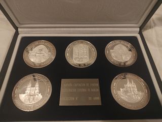 Conjunto de 5 medallas conmemorativas de la restauración de la Catedral de Burgos. Unos 187,50 gr. plata de 925. Viene con su estuche y certificado de autenticidad(para evitar fraudes se ha borrado el número del lote de las fotografías)