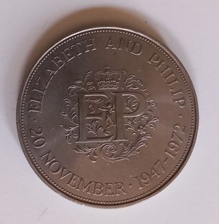 Moneda o medalla conmemorativa del enlace entre la reina Isabel II y el Principe Felipe, duque de Edimburgo. Producida en 1972 para celebrar el 25 aniversario del enlace, celebrado el 20 de noviembre de 1947. Fabricada en cuproníquel (75% cobre-25% nickel). En muy buen estado. Peso: 28'28 g Diámetro: 38'61 mm Canto estriado (grosor): 3'2 mm