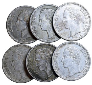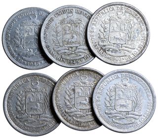 Lote 6 monedas 2 Bolívares Venezuela 1945(2) 1960(4). Plata Ley de 835 milésimas Peso total: 59,78 g Total plata: 49,92 g (59,78 : .835)