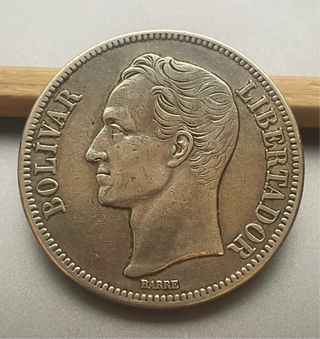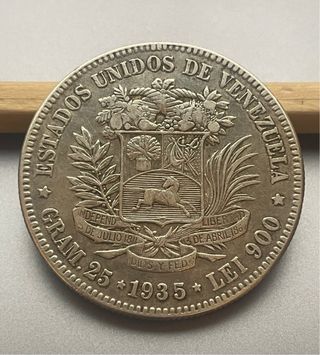 Moneda venezolana circulante de 5 bolívares, 1935, última acuñación de este tipo de moneda. Plata de 900 milésimas, peso: 24,95 gramos.