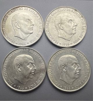 Lote de cuatro monedas de 100 de 1966, Francisco Franco, acuñadas en 1966, 67, 68 y 70. Plata de 800 milésimas, peso medio: 19 gramos.