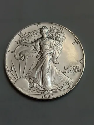 Moneda de plata Onza Águila Americana conmemorativa del año 1987. Sin circular. Nueva - Diseño de la Libertad caminando. - Inscripción IN GOD WE TRUST.