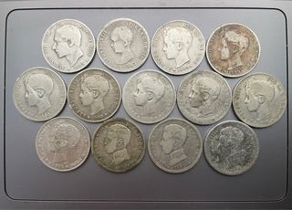 Juego de arras. Conjunto de 13 monedas de 1 peseta de plata de Alfonso XII y Alfonso XIII, años 1883; 1891, 1899, 1900, 1901 y 1903. Plata de 835 milésimas, peso: 62,36 gramos.