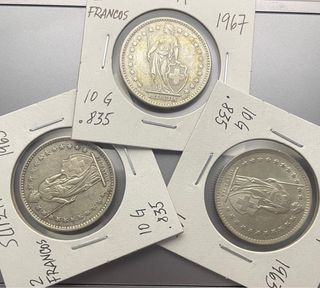2 Francos Suizos Helvetia. 1963, 1965 y 1967