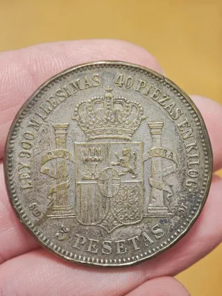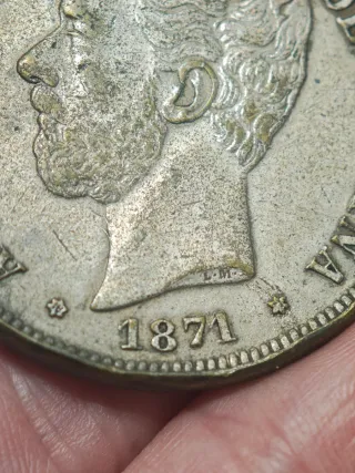 Moneda circulada de Amadeo I del año 1871. Desconozco si es plata, pesa 22.1 gramos, no se pega al imán, el canto está como achatado o deformado. Se ve bien la primera estrella "18" pero no la segunda, hay algo en relieve pero no se ve bien el número. - Peso: 22,1 gramos. - Diseño detallado del busto. - Año de acuñación visible.