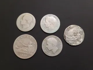 lote NO son de plata son las siguientes replicas : 5 Pesetas 1892 5 pesetas 1871 20 Reales 1837 5 Pesetas 1885 8 Reales 1772 10 Reales 1855 10 Reales 1860 Si interesa alguna en concreto consultar