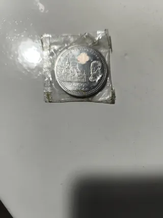 Monedas conmemorativas del viaje del Papa Juan Pablo II a España. Son unas piezas de plata, en buen estado. Muestran el retrato del Papa Juan Pablo II en un lado y el escudo papal en el otro. Precio unitario