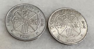 Se venden dos monedas de 100 pesetas de plata. - Diseño con escudo y corona. - Año visible en las monedas.
