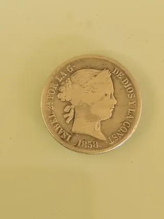 Moneda de 4 reales de plata de 1858, con el busto de Isabel II. - Canto con inscripción. - Leyenda: ISABEL 2ª POR LA G. DE DIOS Y LA CONST.