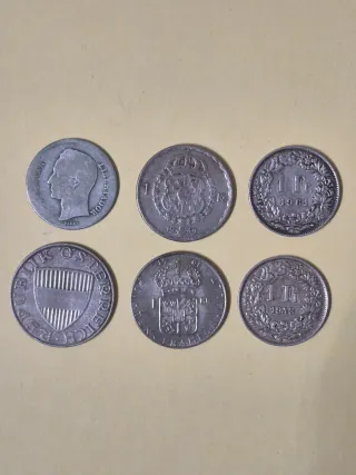 Conjunto de 6 monedas de plata de diferentes países. VENEZUELA: 1 Bolívar (1935) - Plata .835 (Simón Bolívar "El Libertador"). SUIZA: 2 monedas de 1 Franco (1943 y 1961) - Plata .835 (Diseño Helvetia). AUSTRIA: 10 Schilling (1958) - Plata .640. SUECIA: 2 monedas de 1 Corona/Krona (1949 y 1961) - Plata .400. Especificaciones técnicas: Peso total del lote: 36,5 gramos aprox. Contenido de plata pura: +22,9 gramos.