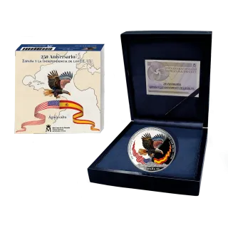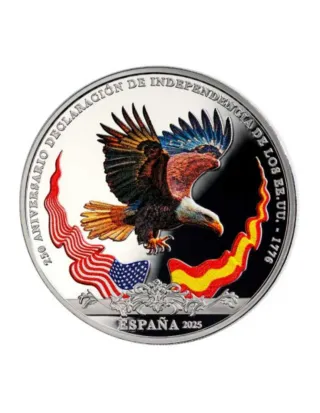 Conmemorativa moneda de 10 euros de plata que celebra el 250 aniversario de la independencia de los Estados Unidos y la relación con España. Incluye estuche y certificado. Carlos III y George Washington - Diseño con águila calva y banderas de España y EEUU. - Año de emisión: 2025. - Realizada por la Fábrica Nacional de Moneda y Timbre.