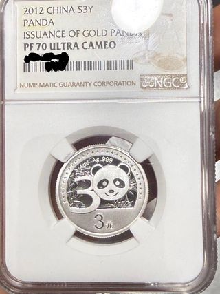 Moneda de plata de la emisión Panda de China del año 2012. - Grado: PF 70 Ultra Cameo. - Plata .999. - Valor nominal: 3 Yuanes. - Certificada por NGC.