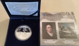 Moneda de 10 euros de España, año 2010, conmemorativa de Francisco de Goya. - Material: Plata. - Denominación: 10 Euros. - Año: 2010. - Tema: Pintores españoles - Goya. - Diseño: Autorretrato de Goya Joven y Duelo a garrotes. - Calidad: Proof. En estuche oficial y con el certificado de garantía. Completamente nueva