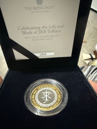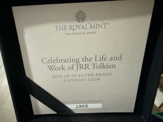 Se vende una impresionante moneda conmemorativa de plata pura emitida por The Royal Mint, perfecta para coleccionistas o grandes admiradores de la obra de J.R.R. Tolkien. ✨ Detalles de la Moneda: • Tema: Celebrando la Vida y Obra de J.R.R. Tolkien. • Emisión: 2023. • Denominación: £2 (Dos Libras Esterlinas). • Metal y Acabado: Silver Proof Piedfort (Plata de Ley, calidad Proof con grosor doble - Piedfort). • Certificado de Autenticidad: Incluido. • Número de Certificado: 1363. 📦 Estado: • Cana original y el certificado de autenticidad está intacto, tal como se muestra en la imagen. El Señor de los anillos / El Hobbit