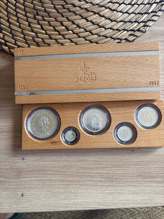 Conjunto de monedas de plata conmemorativas del Quinto Centenario. - Presentado en una caja de madera. - Incluye varias monedas de plata. - Diseño grabado en la tapa de madera.